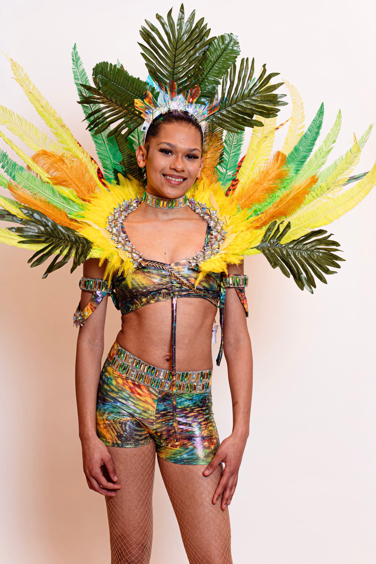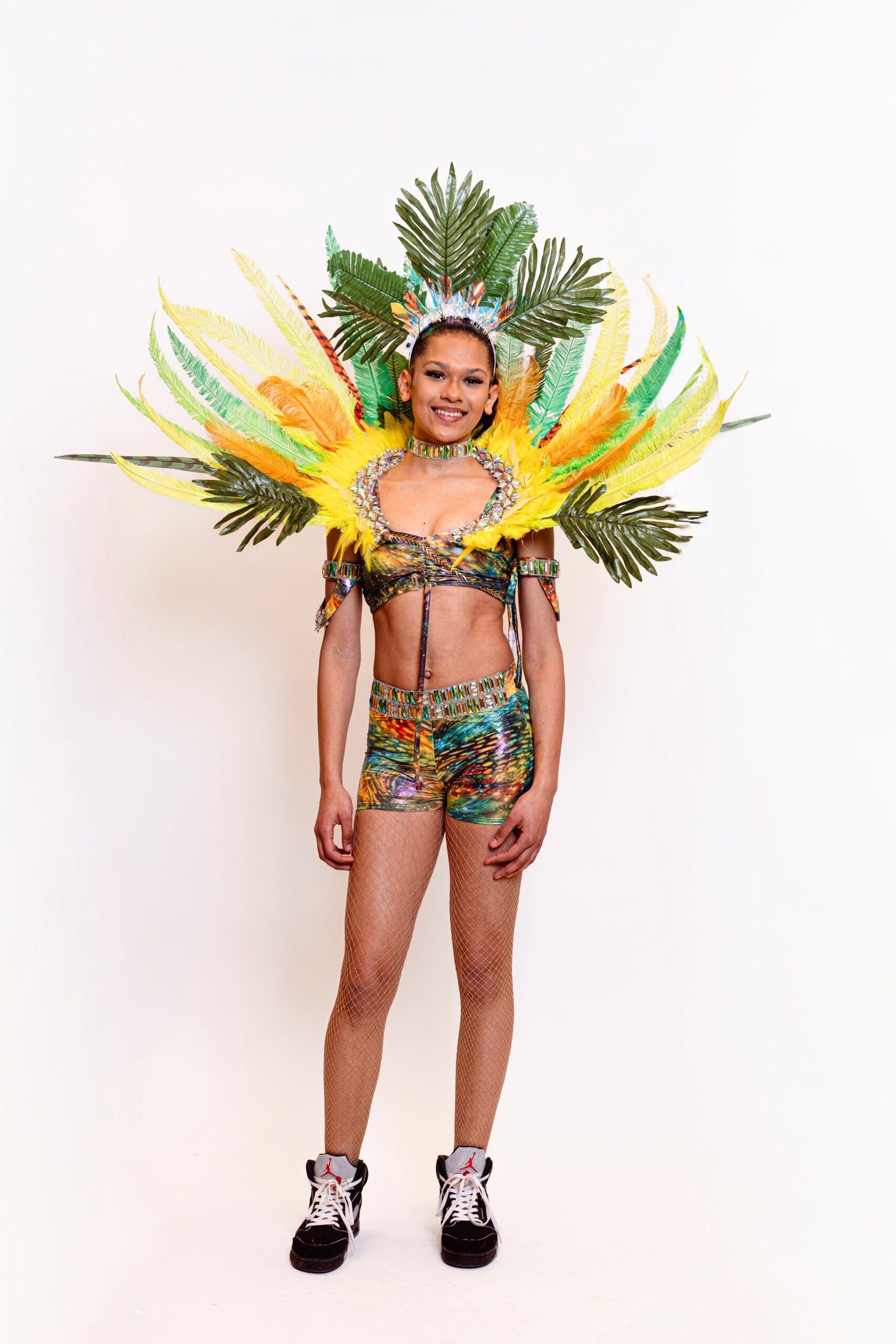 Step into the heart of nature with the Jungle Riddim Earth Elemental Female. A gemmed jungle bra top gleams among lush greens, while matching jungle shorts, leg pieces, arm bands, and a detailed headpiece bring the wild rhythm to life. It’s bold, untamed, and filled with youthful carnival magic — perfect for teens embracing their first road experience.